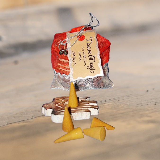 30 herrlich duftende Räucherkegel mit Räucherkegelhalter im Organza Beutel.